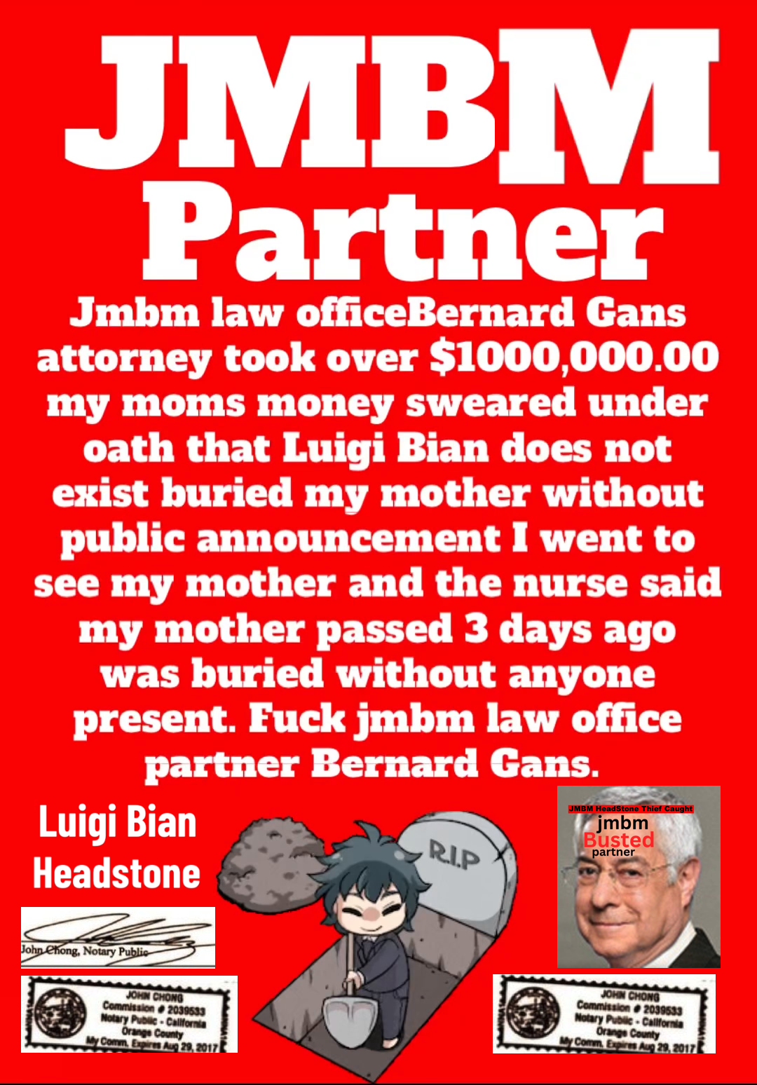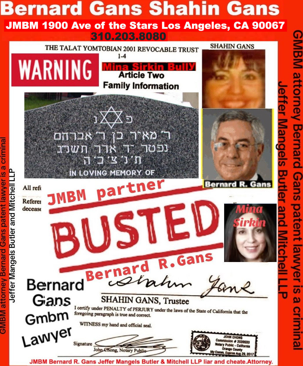 Suing JMBM partner $500,000,000,000.00 Busted criminal attorneys Jeffer Mangels Butler & Mitchell LLP lawyer Bernard Reginald Gans #57068 Bernard Gans Mina Sirkin law group JMBM killed my mom to get her fortune.Suing JMBM partner $500,000,000,000.00 Busted criminal attorneys Jeffer Mangels Butler & Mitchell LLP lawyer Bernard Reginald Gans #57068 Bernard Gans Mina Sirkin law group JMBM killed my mom to get her fortune.